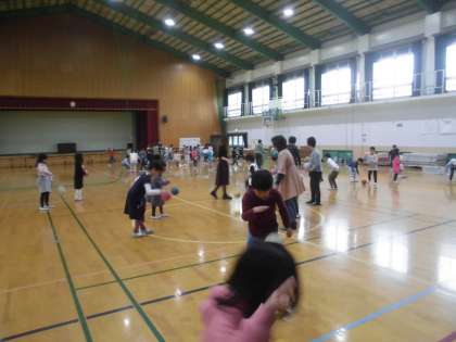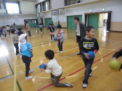 「あんたがたどこさ」の歌に合わせて,リズムよくまりをついたり,足を上げたりしました。