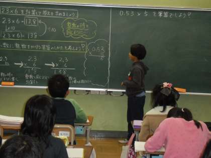 小数のかけ算の学習をしています。計算の仕方を考えていると,「整数のときと同じように計算して,先に「×10」したので,計算した後に「÷10」すれば簡単に計算できることに気づきました。