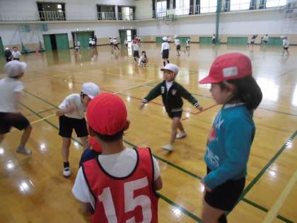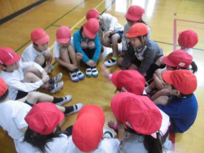 体育科「じんとりあそび」の学習です。勝つためには,一人ひとりが好きなように動くよりもチームで作戦を立てて協力することが大切です。みんなの意見を聞きながら上手に作戦を立てています。作戦は成功したかな?