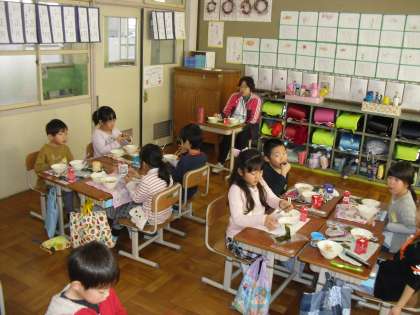 今日の給食は「五目たきこみごはん」にのりがついていたので,のりを巻いておにぎりにして食べました。仲良し会でおにぎりづくりをしたので,上手に巻いて食べられました。