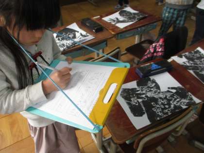 紙版画の鑑賞を行いました。自分の作品の工夫したところや,友だちの作品のいいところをたくさん見つけることができました。