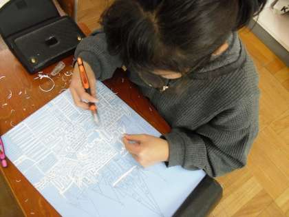 4年生は,線彫りで「世界に一つだけのお城」を彫っています。みな集中して初めて使う彫刻刀を使って彫り進んでいました。