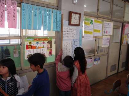 1mものさしを使って,教室の中の1mのものを探しました。