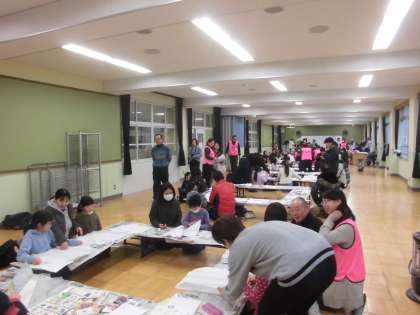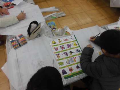 少年補導,おやじの会主催の凧作りがありました。凧あげ大会に向けて凧に絵を描いています。