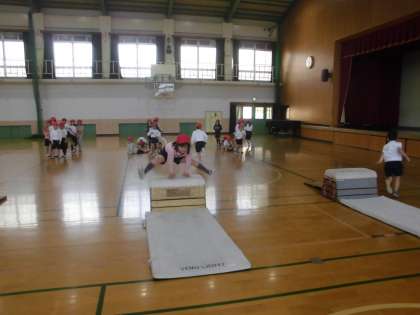 体育科「とびばこ遊び」の学習です。開脚とびに挑戦しています。