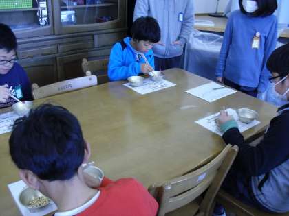 中間休みに,給食委員会主催の「まめつまみ大会」に参加しました。4年生の最高記録は「14個」皆集中してまめを割り箸でつまんでいました。