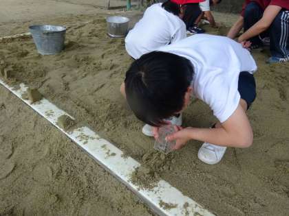 砂場でいろんな道具を使って,形を作りました。カップに砂を詰めて,逆さまにして四角の形をたくさん作っている人もいました。また,大きな山を作ってトンネルを掘ったりしている人もいました。自分たちで色々考えながら楽しく形を作っていました。