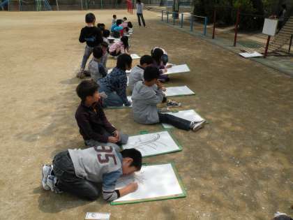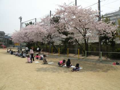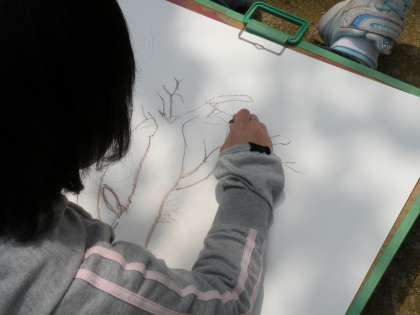 3年生では,校庭にある美しい桜の木をコンテを使って描きました。その後,桜の木の近くで遊んでいる自分の姿を描き入れ,最後に絵の具で仕上げていきます。
