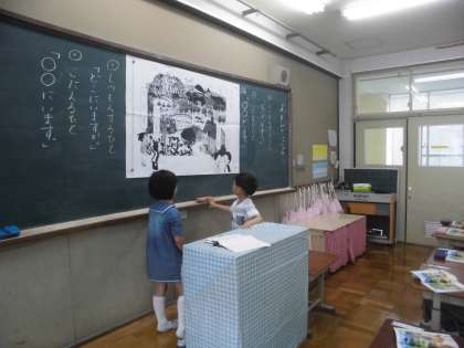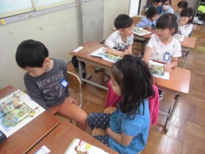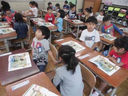 国語科「えをみてはなそう」の学習です。「なにがいますか。」「どこにいますか。」などの質問をする人と,「かえるがいます。」「池の葉っぱの上にいます。」などの答える人に分かれて,絵を見ながら楽しく伝えあいました。
