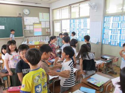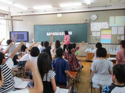 外国語活動では,授業の中で表情やジェスチャーも意識しています。友だちとのコミュニケーションも大切に活動しています。