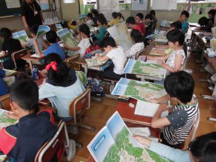 3年生では,資料を使って方位に気を付けながら,京都市の様子を調べています。「北,東,西には山がある。」,「川が流れている。」,「高速道路が通っている。」・・・気づきが広がっていきます。後日に行う社会見学で,気づきを確かめていきます。