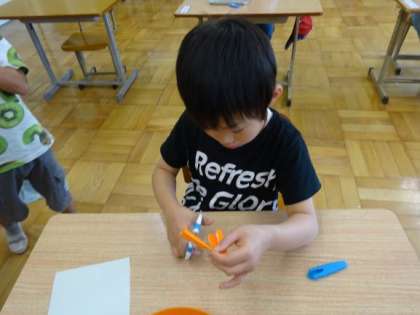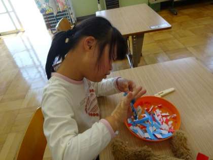 お誕生日会に向けて,くす玉に入れる紙を作っています。折り紙を2回折って,ハサミを使って切っています。たくさんの量の折り紙を入れられるように,どんどん切り紙を作っていきたいと思います。
