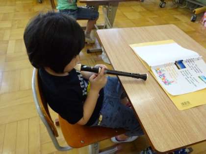 音楽の時間に,リコーダーを吹きました。どんな音が鳴るのか楽しみに吹いていました。笛星人の曲に合わせて,演奏しました。これからいろんな楽器に慣れて欲しいと思います。