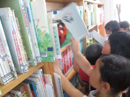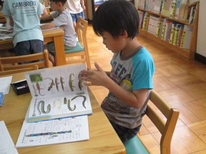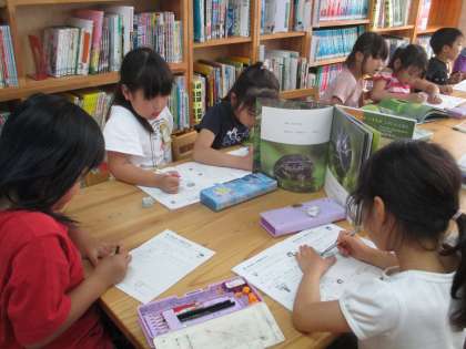 生活科で小さな生き物(虫)の学習をしています。まずは図書室でどんなところに住んでいるかや,どんなものを食べているかを調べました。