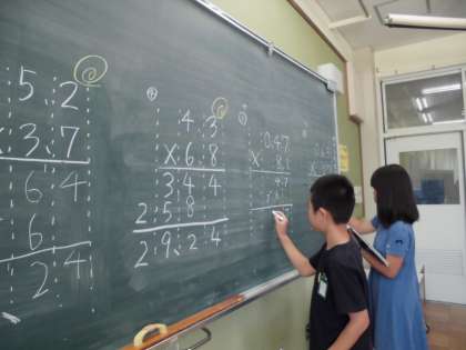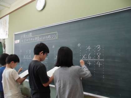 算数の時間に小数×小数の筆算を学習しました。小数点をうつ位置に気をつけていきます。