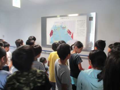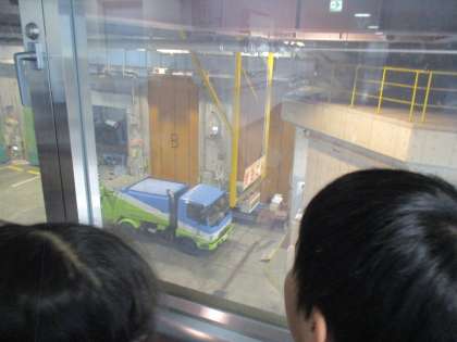 クリーンセンターの中を見学しました。パッカー車がごみを運んでくる様子を見たり,大きなクレーンで細かくなったごみを移動させているところを見ました。ごみを燃やした熱で発電していると聞いて驚いていました。