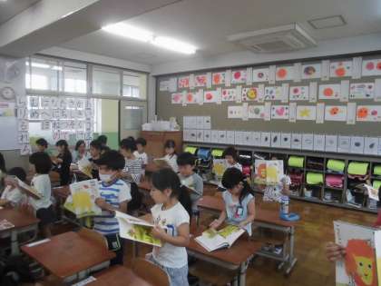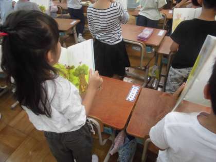 国語科「はなのみち」では,音読の練習を頑張っています。音読ができた子は座って黙読です。