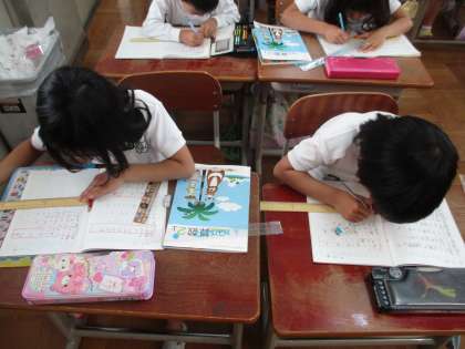 算数で長さの学習をしています。30センチものさしを使って上手に直線を引いています。長さの計算も頑張っています。