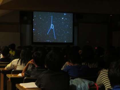 予定していた天体観測が、雲が多いため中止になりました。とても残念ですが、こんな時のための「星空DVD」を所員さんが用意してくれました。きれいな星座の起源などを知ることができました。