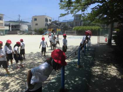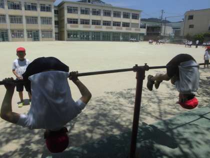 体育科「鉄棒遊び」では,つばめやふとん,ダンゴ虫になりきって鉄棒に慣れていきました。