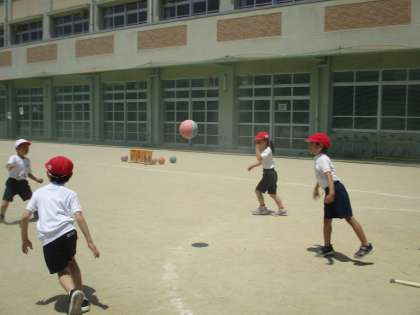 体育でパスゲームをしています。前半戦と後半戦で戦います。途中で作戦タイムをとり,グループで話し合いをして後半戦をしました。とても楽しく学習できました。