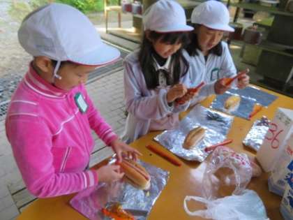 3日目の朝食は,ホットドックを牛乳パックで焼き上げる"パックドック作り"です。