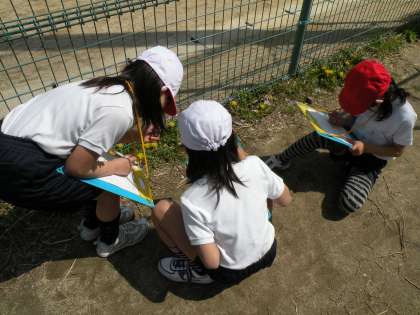 校庭に咲くタンポポの色・形・大きさなどに気をつけて「見つけたよカード(観察カード)」に記録しています。