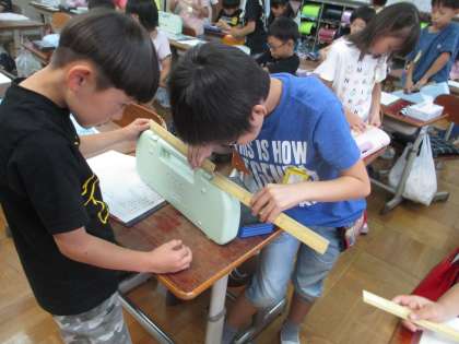 教室にあるものの長さを30センチものさしを使って測りました。予想とピッタリだった人や,予想とは違った人がいましたが,「ノートってこれくらいの長さなんだ。」「鍵盤ハーモニカは結構長いんだ。」と楽しく学習ができました。