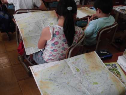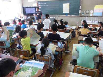 地図を見ながら,京都市の地形の特徴について学んでいます。