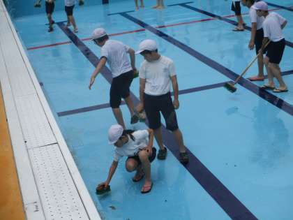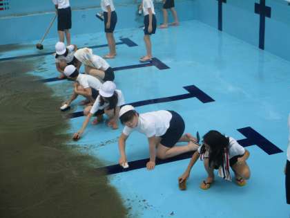 プール清掃を行いました。みんなが気持ちよく使えるために泥を流して床や壁をきれいに磨きました。人のために率先して動く素敵な姿が見られました。