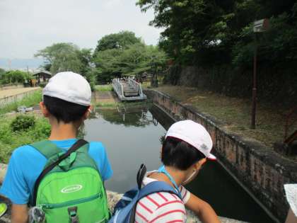蹴上駅に到着しました。まず初めに,蹴上インクラインに行きました。第3トンネルの出口や田辺朔郎像がありました。第2疏水が唯一見える所と聞いて子どもたちも驚いていました。