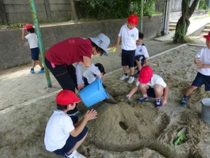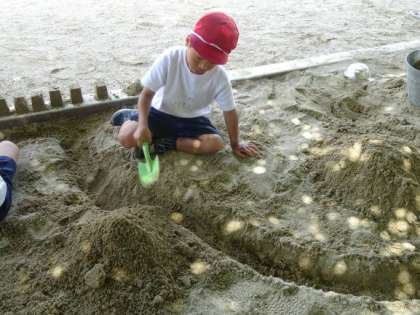 砂場でみんなで大きな山や川を作りました。大きな山の中にトンネルを作ったり,バケツで水を流したりしました。水が流れる様子が楽しくて,何回も水を流している様子が見られました。