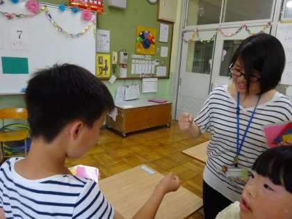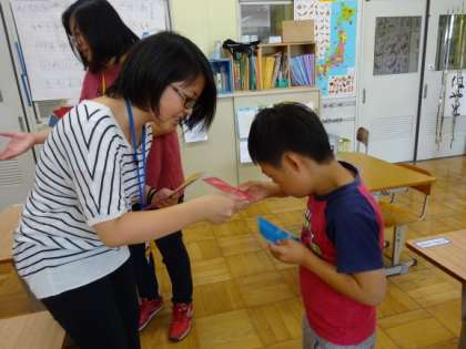 色の言い方を覚えて,友達と自分の好きな色のカードを聞き合いました。5枚とも自分の好きな色のカードが集まるように外国語で交流していました。