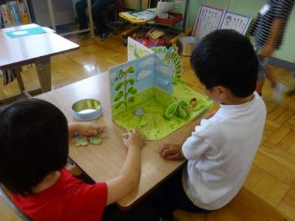 休み時間に2人で「そらまめくん」の本を読んでいます。一緒にそらまめくんを動かしながら,お話を作っていました。またいろんな本も読んでくれたらなと思います。
