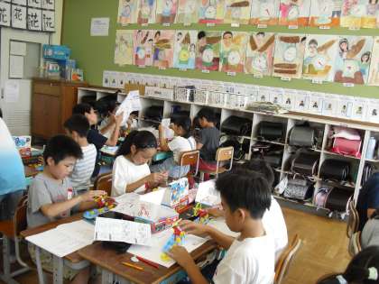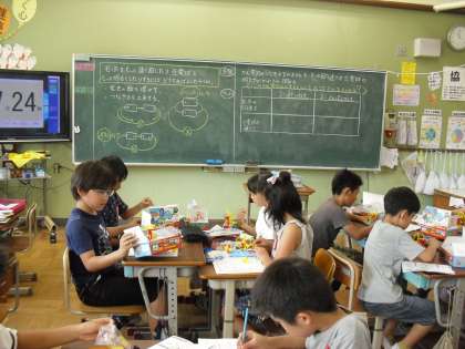 乾電池1つの時に回る,モーターの速さや,豆電球の明るさが,電池を2本にするとどうなるかを,「直列つなぎ」「並列つなぎ」で,実験してみました。直列つなぎの時のモーターの回転の速さと,並列つなぎでの,1本の時と変わらない回転に驚いていました。