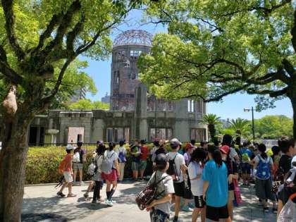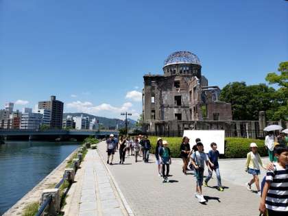 約5時間の移動を経て,原爆ドーム前に到着しました。原爆ドームから原爆の子の像で平和集会をしました。
