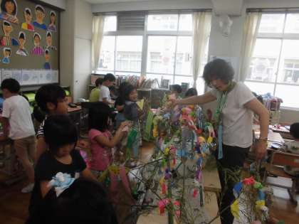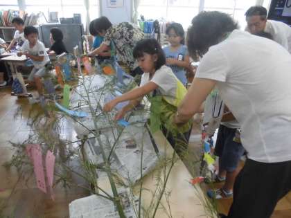 紙飾りができたら笹の葉につけました。