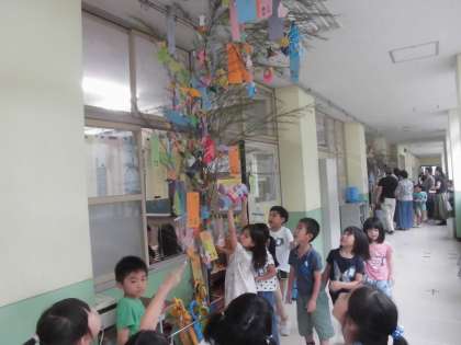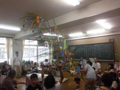 天井に届くほどの特大の笹の葉に綺麗な七夕飾りがつけられました。次回の仲良し会も楽しみです。