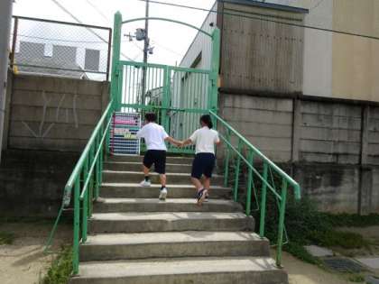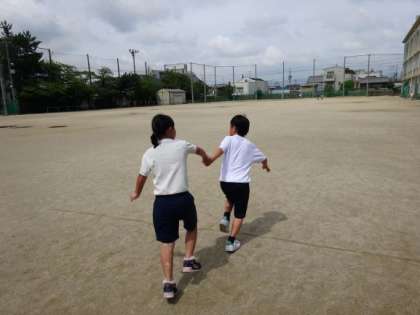 ちょっとマラソンで入っている時に,二人で仲良く手を繋ぎながら走っていました。一緒にカードを取りボードに貼った後,また一緒に走っていました。