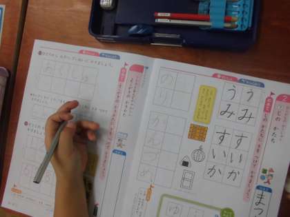 書写ノートも終わりに近づいてきました。ひらがなの読み書きはもちろん,「ちゃ」「ちゅ」「ちょ」や「は」「を」「へ」などの書き方や使い分けをしっかりと定着させましょう。