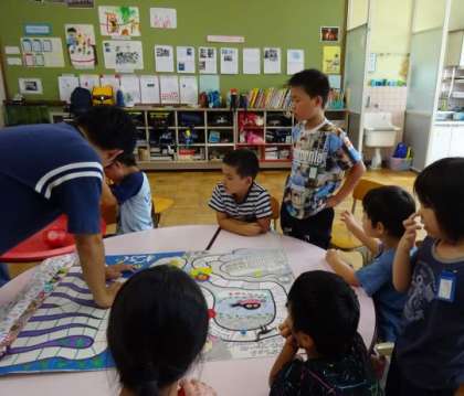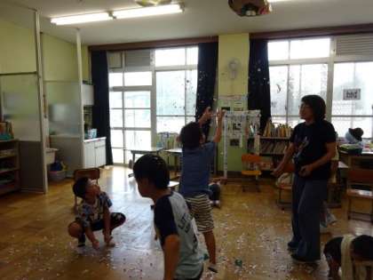「みんなであそぼう」では,プレゼントすごろくをしました。何度も戻ってしまうことが多く,なかなか前に進めず苦戦しながらも,みんな楽しそうに参加していました。また「くす玉わり」では,みんなで紙を巻きながら一生懸命お祝いしました。