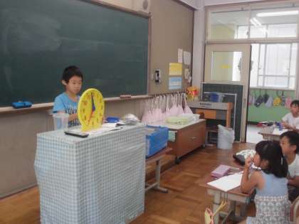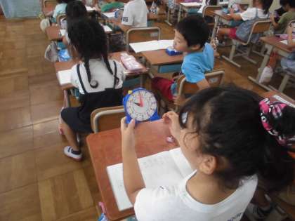算数科「とけい(1)」の学習です。とけい(1)では,丁度の時刻と半の時刻を学習します。