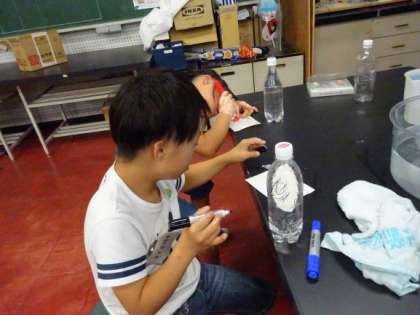 実験室で「浮沈子」を作りました。ペットボトルの中に水を入れたり,浮沈子に色を塗ったりしました。ペットボトルを押すと,浮沈子が動いたり沈んだりすることに驚いていました。