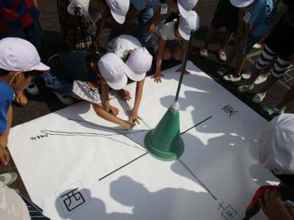 理科の学習で,影の動きを学習しています。時間をずらして記録しました。