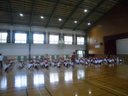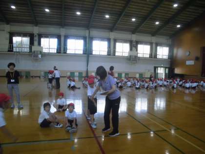 50メートル走と障害物競走で何番目に走るのか,どのコースを走るのかを発表しました。どちらも同じ順番とコースなので,お家でも聞いてあげてください。