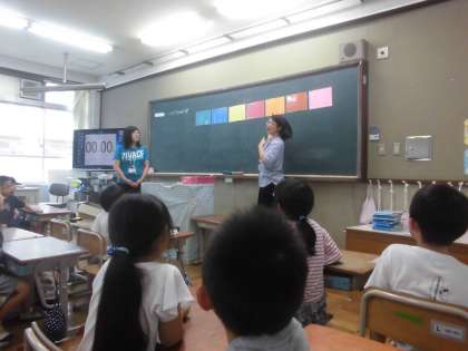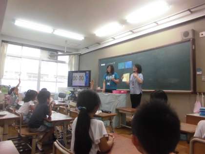 中辻先生とカヤン先生と一緒に外国語の学習をしました。今日は言われた色を探して指をさすゲームをしました。