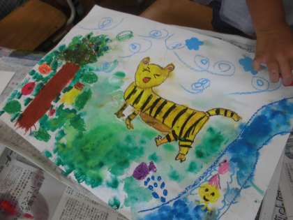 水をたっぷり画用紙に塗ってから,色をつけます。