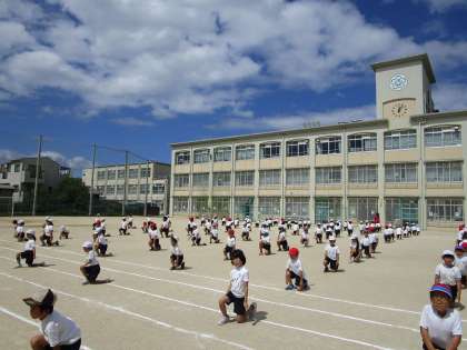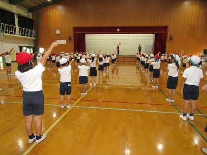 運動場に出て練習をしました。体育館より広く,真っすぐ並ぶだけでも大変でした。ダンスは,楽しんで練習していて,上手に踊れるようになってきました。旗を持っての練習が楽しみです。