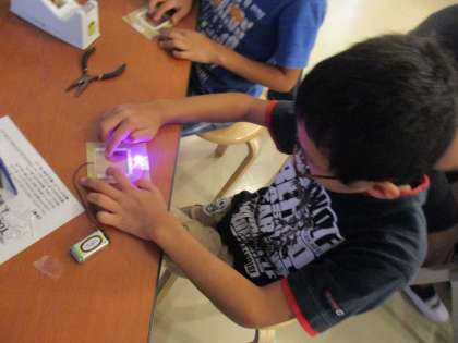 タッチパネルが完成しました。触るとLEDライトが光ります。触る位置を変えると色が変わります。