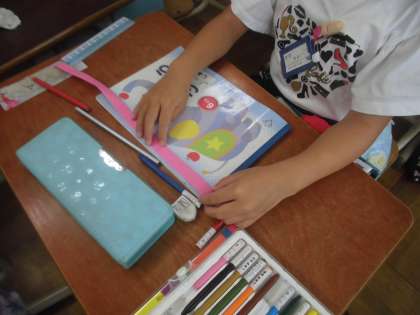算数科「大きさくらべ(1)」の学習では,テープを使ったり身の回りのものを使って大きさを比べています。
